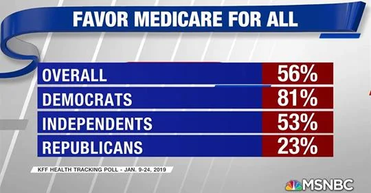 [Image Description: This image has a grey background with white, angled stripes. On the top of the image is a blue banner with white letters reading, “Favor Medicare for All”. Below it sits four blue rows that read from top to bottom, “Overall, Democrats, Independents, Republicans”. Corresponding to these rows are rows with red boxes with white writing that read from top to bottom, “56%, 81%, 53%, 23%”. ]
